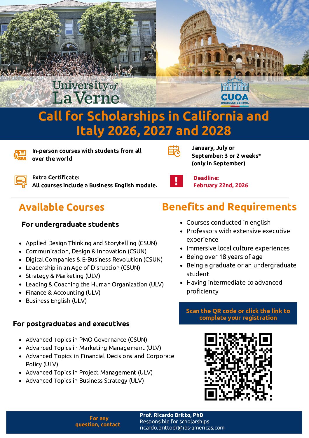 We are pleased to announce that applications are now open for scholarship programs in California and Italy for the 2026, 2027 and 2028 academic terms. These programs are offered in partnership with two prestigious institutions: University of La Verne and the CUOA Business School.